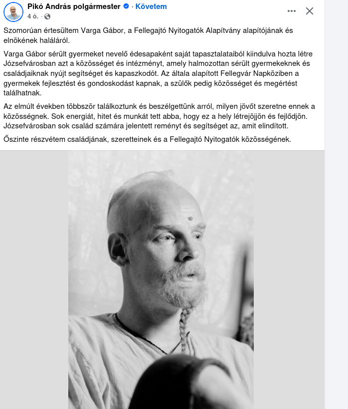 Pikó András polgármester | Szomorúan értesültem Varga Gábor, a Fellegajtó Nyitogatók Alapítvány alapítójának és elnökének haláláról.