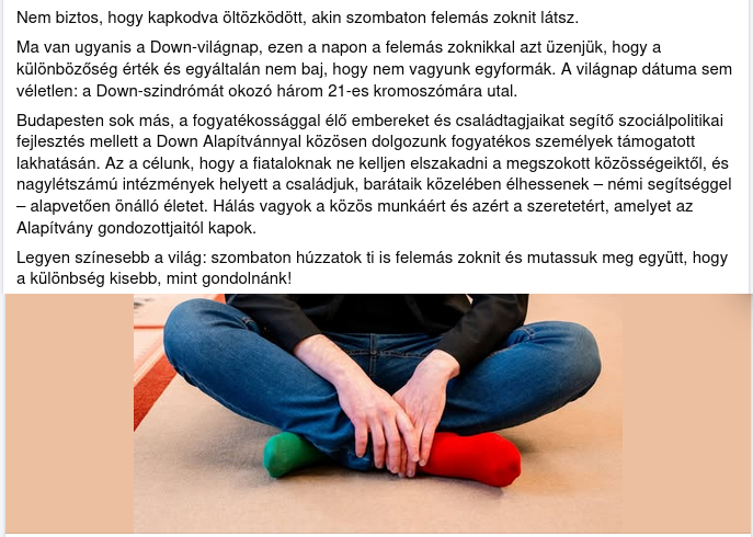 Ma van ugyanis a Down-világnap, ezen a napon a felemás zoknikkal azt üzenjük, hogy a különbözőség érték és egyáltalán nem baj, hogy nem vagyunk egyformák. A világnap dátuma sem véletlen: a Down-szindrómát okozó három 21-es kromoszómára utal.